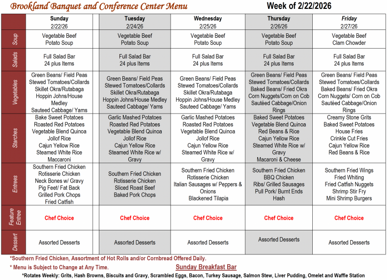 Join us for lunch each week, unless specified otherwise, during the below times: