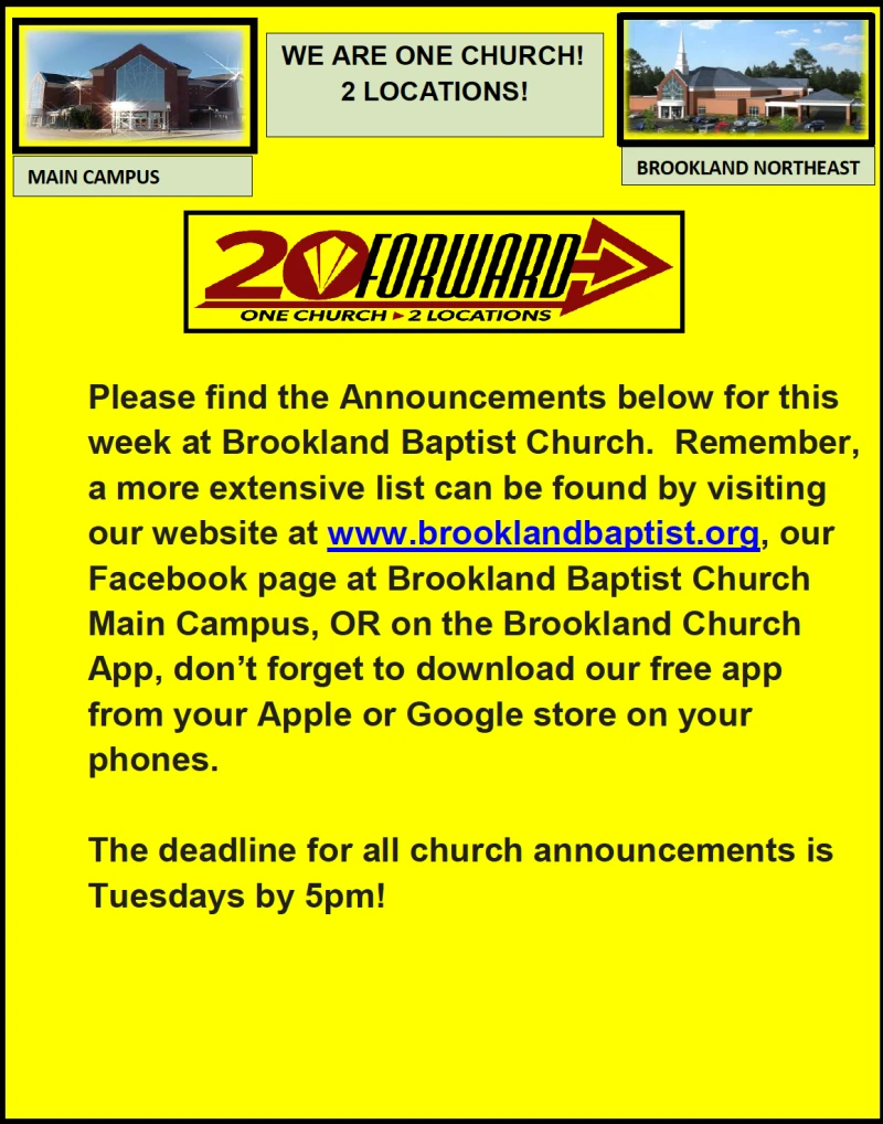 DON'T FORGET TO LISTEN TO SUNDAY SERMONS, VIEW THE BROOKLAND STAR, AND SEE WEEKLY ANNOUNCEMENTS ON THE BROOKLAND APP!